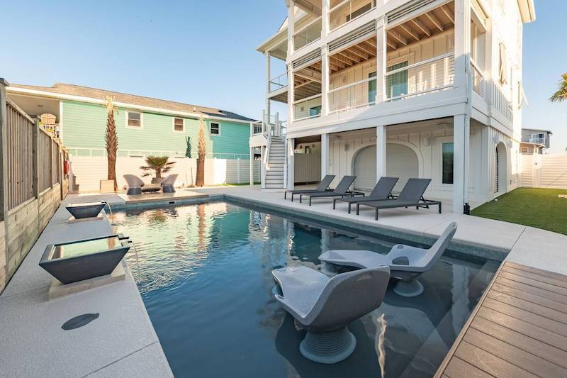 Vacationers looking for modern luxury will find it here at Villa Kai. This 8-bedroom, 8.5-bath home offers breathtaking views of the Atlantic, a beautiful outdoor living space with a private pool and cozy fire pit, and a chef-inspired gourmet kitchen. The pool is a treat in itself with two cascading water features, a tanning ledge, and the option to be heated in the colder months. Book this oceanfront getaway and experience why Holden Beach was ranked #1 for the ‘Calmest and Quietest’ Beach in America.